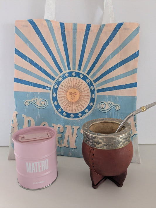 Set Tradicional Argentino: Totebag Argentina + Lata Matera Marwal + Mate Calabaza Marrón con Virola Acero Grabada + Bombilla – ¡El Kit Clásico con Alma Gaucha! 🧉